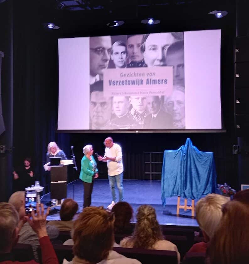 Vanzelfsprekend was ook het Stadsarchief Almere aanwezig, dus direkteur Erin Jansen op het podium, ook zij ontving een boek. Ook Kees Tak, namens het 4/5 mei Comite, werd op het podium gevraagd, waarna hij Marco Penninkhof en Richard Schuurman -symbolisch- maar een echt boeket overhandigde. De schrijvers meldden allebei dat ze hun boek opgedragen hadden aan Shira Waage, de onlangs onverwacht en veel te jong, overleden voorzitter van het 4/5 mei Comite Almere.