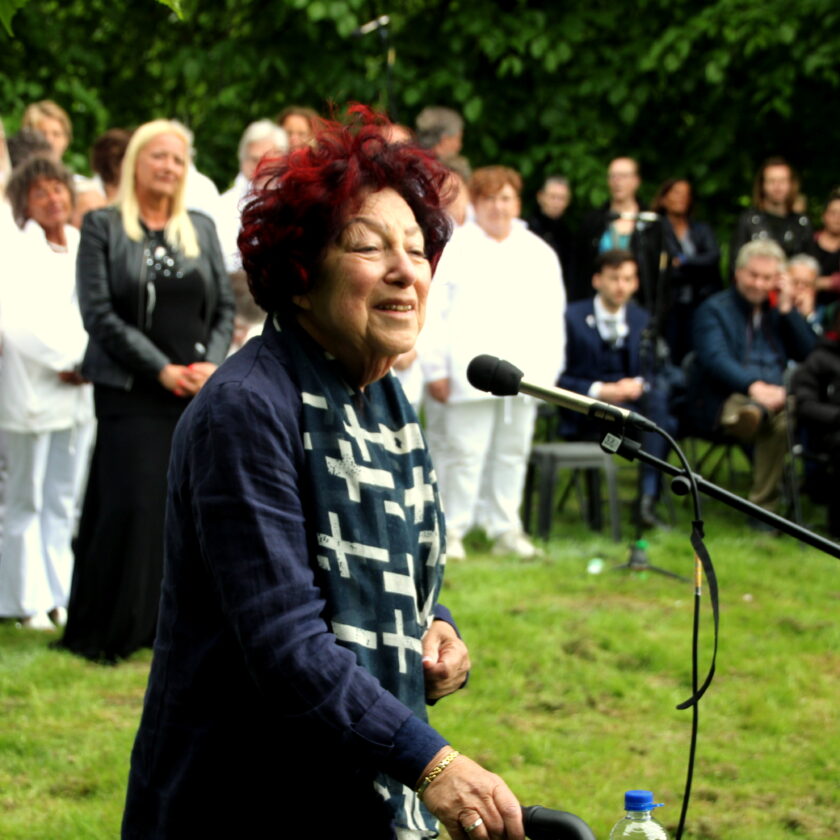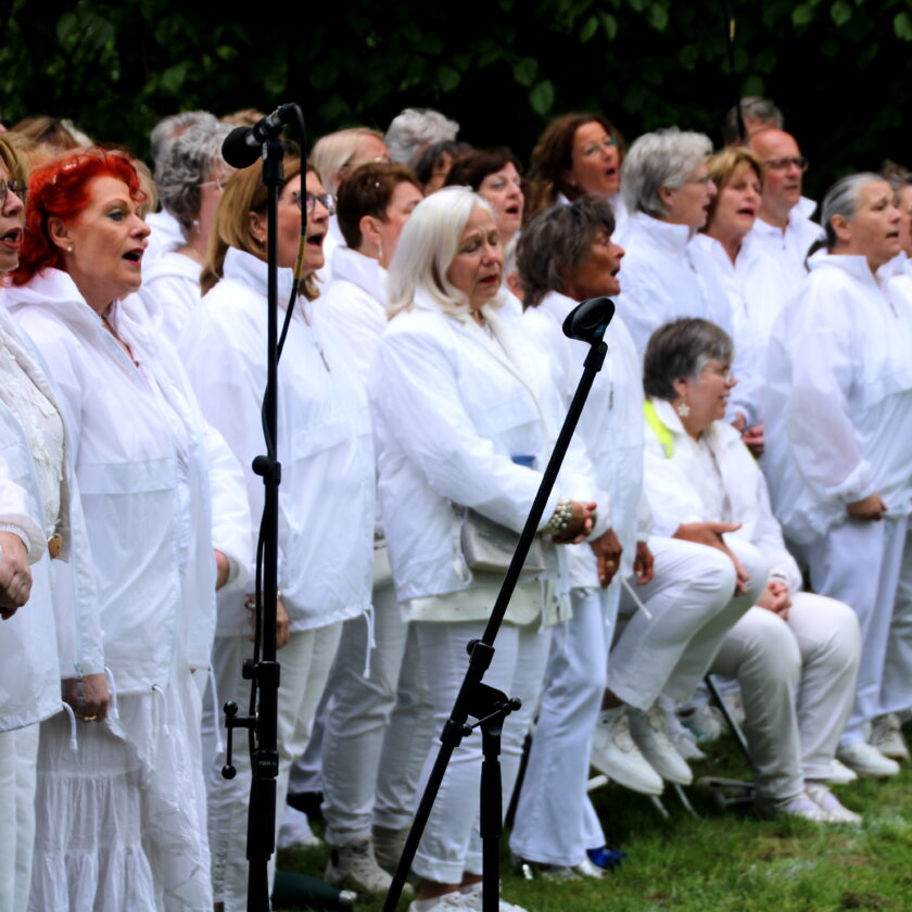 Diverse sprekers en een groot koor waren aanwezig.