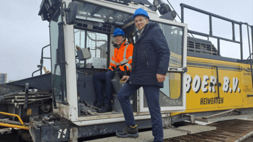 In het Olympiakwartier in Poort is donderdag de bouw van 41 sociale huurwoningen begonnen. PvdA-wethouder Paul Tang (links) sloeg de eerste paal van het complex…